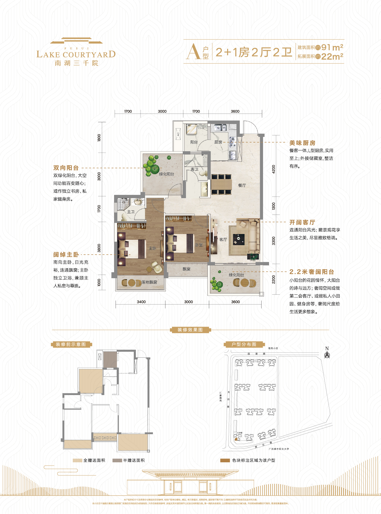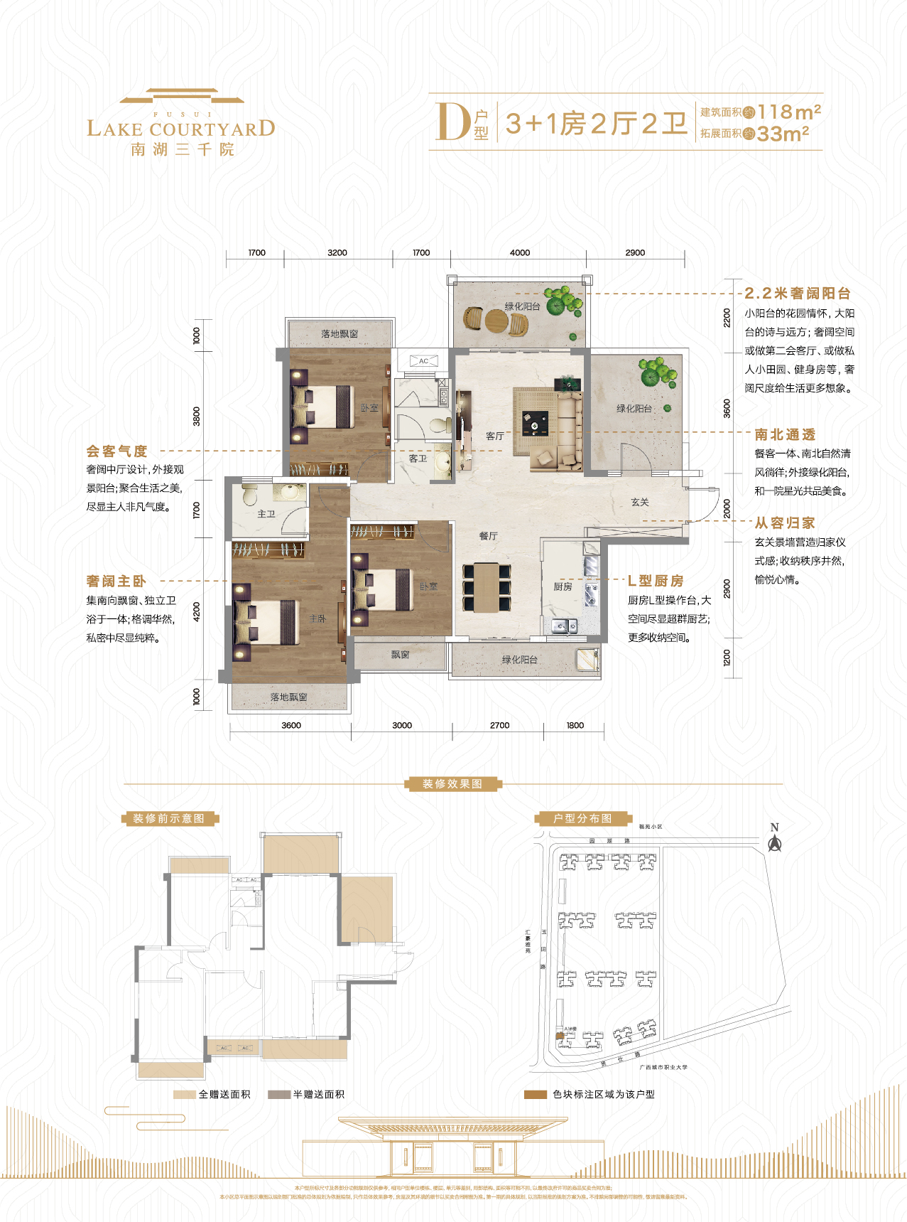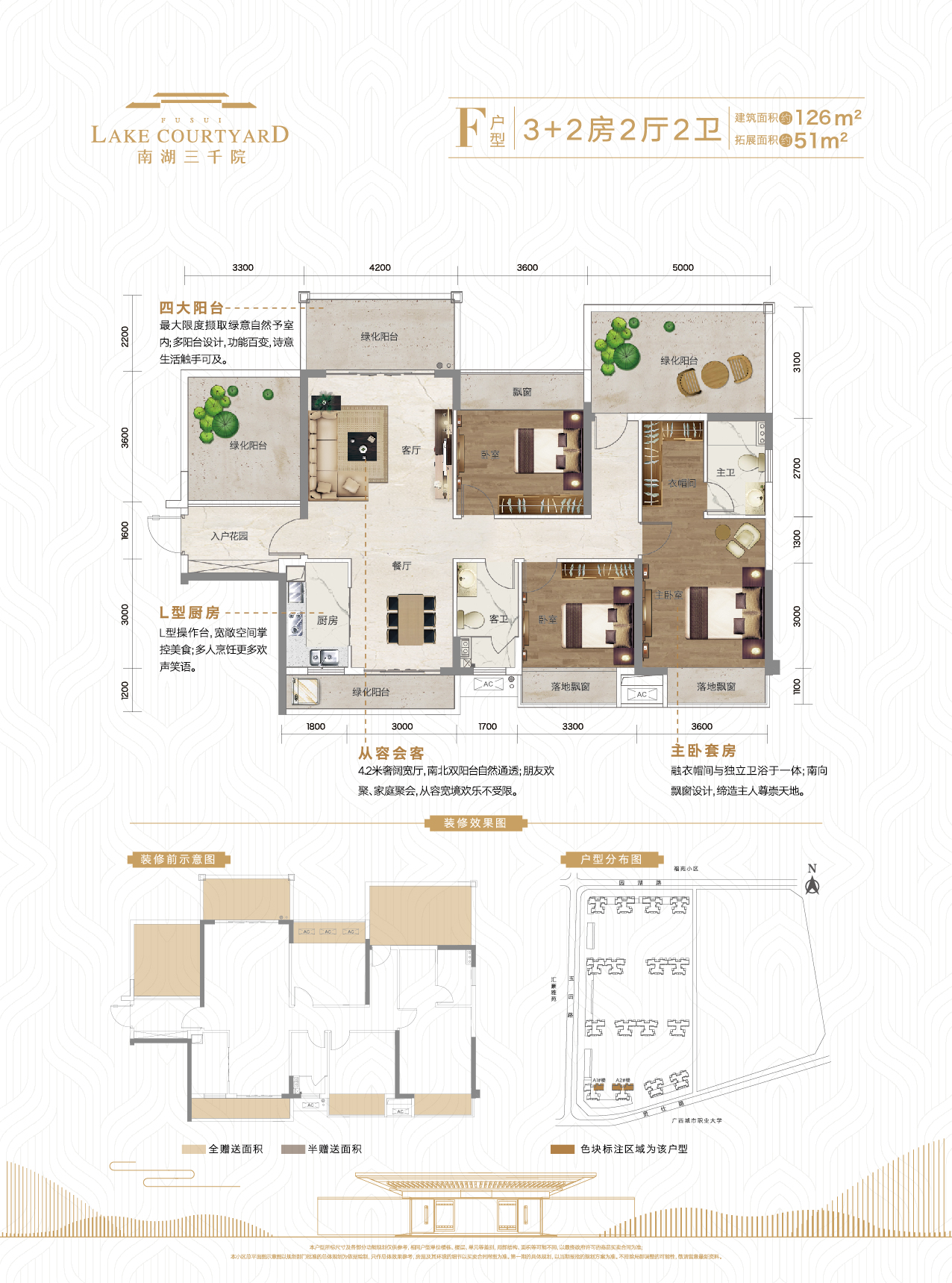 1.约126㎡3+2房,赠送面积高达51㎡,双阳台设计,户型方正,南北采光通风优越; 2.1.6米宽入户花园、2.2米宽景观阳台、4.8米长生活阳台; 3.近百米楼间距,约29㎡超大主卧,配备落地飘窗、私人衣帽间。